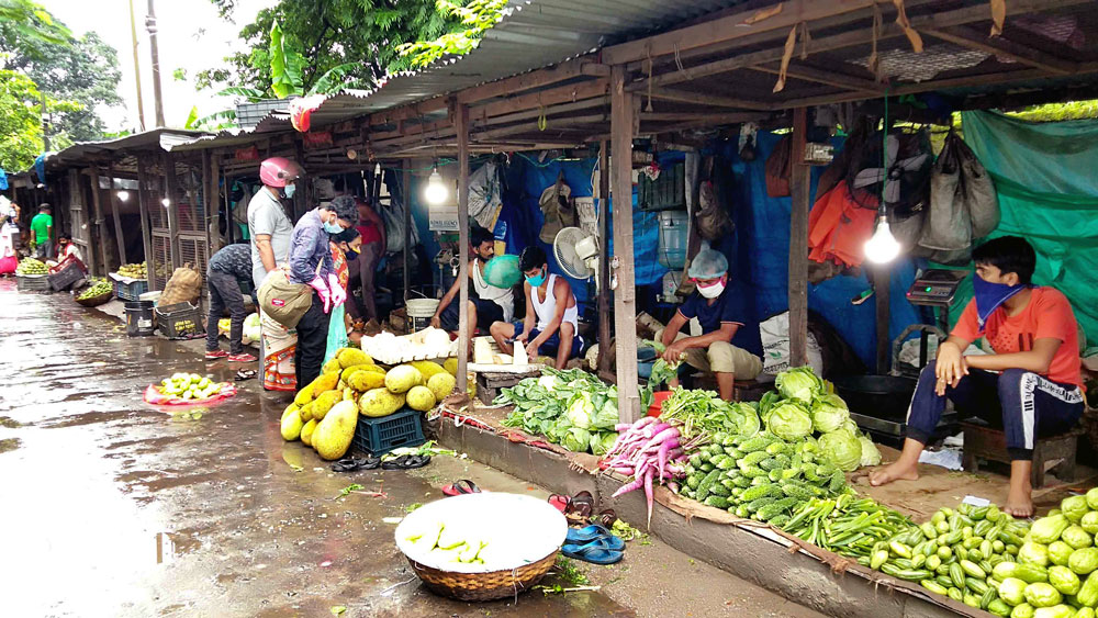 নিবেদিতা রোডে বাজারে একটি চায়ের দোকানে জটলা পাকিয়ে বসে অনেকে। চা খাচ্ছেন। রাস্তার উল্টোদিকে আনাজের দোকানের সারি। মাঝে ডিভাইডারের উপরেও আনাজ, ফল নিয়ে বসেছেন ব্যবসায়ীরা। রাস্তার উপরে ভিড় করে দাঁড়িয়ে কেনাকাটা চলছে। অনেকের মুখেই মাস্ক নেই। ক্রেতা, দোকানদারদের মধ্যে দূরত্ব বিধি নেই। লাগোয়া চম্পাসারি মোড়। সেখানেও আনাজের বাজারে ভিড়। রাস্তায় ভিড়। মোড়ের মুখে একদিকের রাস্তা ব্যারিকেড দিয়ে আটকানো।