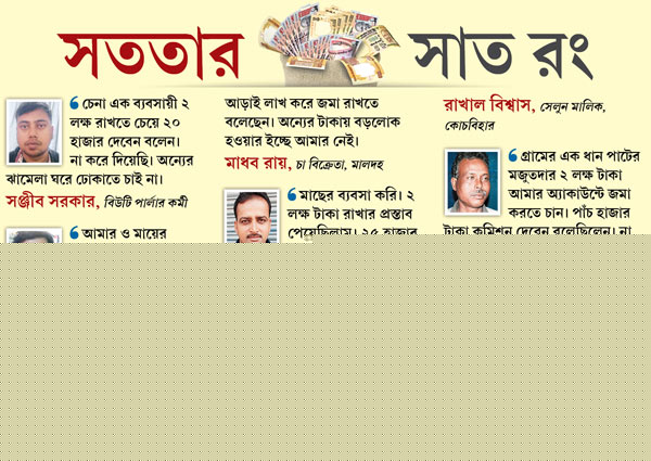 ওঁদের কেউ সেলুন চালান। কারও চায়ের দোকান। কেউ চুক্তির ভিত্তিতে বিউটি পার্লার চালান। কেউ আবার সামান্য জমিতে চাষবাস করে দুবেলা স্ত্রী-ছেলেমেয়েকে ঢাল-ভাত জোটাতেই হিমশিম। কেউ আবার পাহাড়ি পথের গাড়ির চালক। শিলিগুড়ির হাকিমপাড়ার পার্লার কর্মী থেকে মালবাজারের চা শ্রমিক, ফালাকাটার চাষি কিংবা কোচবিহারের সেলুন মালিক—নিজের অ্যাকাউন্টে রাতারাতি দু-আড়াই লাখ টাকা জমা করার টোপ ফিরিয়ে দিতে কেউ কারও চেয়ে কম যান না। কেউ সবিনয়ে ফিরিয়েছেন। কেউ নানা কায়দায় পাশ কাটিয়েছেন। কারও বক্তব্য, ‘‘সংসারে অভাব থাকতে পারে। তা বলে পরের ঝামেলা নিজের অ্যাকাউন্টে নিয়ে শর্টকাটে বড়লোক হতে চাই না। খেটে খাচ্ছি, খেটেই খাব।’’ আবার কেউ স্পষ্ট বলে দিয়েছেন, টাকাটা নেওয়ার পরে থানা-পুলিশ-আয়করের জেরার মুখে পডার আশঙ্কায় তাঁরা ও পথে হাঁটতে রাজি নন। কয়েকজন তো এটাও মনে করেন, যাঁরা ফাঁকতালে উপার্জন করে রাশি রাশি টাকা জমিয়েছেন, তাঁদেরই ভোগা উচিত।