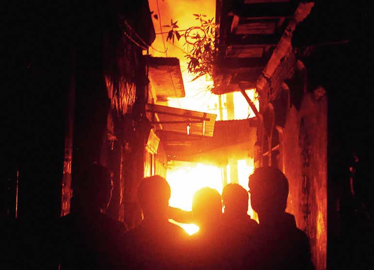 ভয়াবহ আগুনে পুড়ে গেল জলপাইগুড়ি শহরের দিনবাজারের প্রায় শখানেক দোকান। বৃহস্পতিবার রাত সাড়ে এগারোটা নাগাদ বাজারের মুড়িপট্টিতে প্রথম আগুন লাগে। পাশেই ছিল বাজির দোকান এবং গুদাম। মুড়িপট্টি থেকে আগুন সে সব দোকানে লাগতেই তা ছড়াতে থাকে আশপাশের অন্য দোকানেও। মুহূর্মুহূ বাজির আওয়াজে আতঙ্কিত বাসিন্দারা ঘর ছেড়ে বেরিয়ে আসেন। আগুনের তীব্রতা এতটাই বেশি ছিল যে তাঁরা কাছে ঘেঁষতে পারেননি। দোকান থেকে আকাশে উঠে গিয়েও অসংখ্য আতসবাজি ফাটতে থাকে।