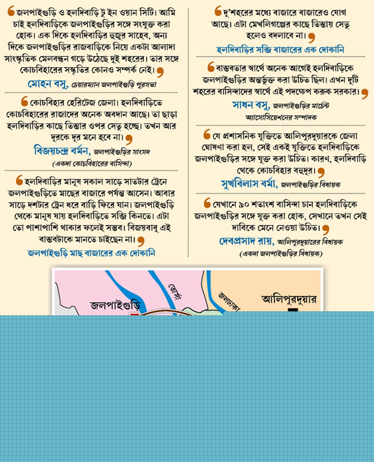 জলপাইগুড়ির মানুষও চান, তাঁদের জেলাতেই যুক্ত হোক হলদিবাড়ি। তাঁরা মনে করেন, এই দুই শহরের বাসিন্দারা একে অন্যের উপর নির্ভরশীল। কোচবিহারের মানুষের মুখে এর উল্টো কথা। বিপরীত যুক্তি। আজ দ্বিতীয় পর্বে দুই জেলা সদরের কথা শুনলেন রাজা বন্দ্যোপাধ্যায়