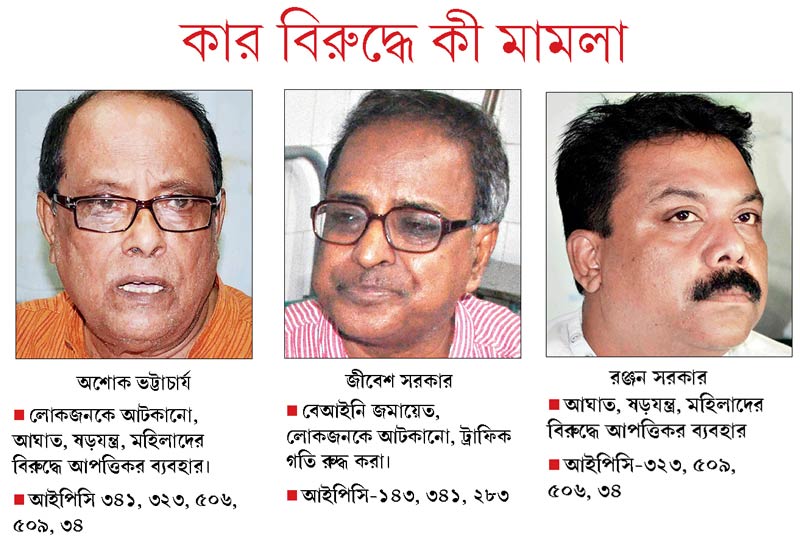 পুলিশ সূত্রের খবর, শনিবার মাথায় চোট, উচ্চ রক্তচাপের কথা জানিয়ে মেয়র হাসপাতালে ভর্তির পর শাসক দলের দুই কাউন্সিলরও বুকে ব্যথার কথা বলে হাসপাতালে ভর্তি হন। ততক্ষণে বামেরা হাসমিচকে রাস্তা অবরোধ করে। অবরোধ উঠতেই, ৭টা ২৫ মিনিটে পুলিশ রাস্তা আটকানোর প্রথম মামলাটি নিজেই করে। সিপিএমের জেলা সম্পাদক জীবেশবাবু-সহ ৫ জন নেতা ও ২০০ কর্মীর বিরুদ্ধে। মিনিট দশকের মধ্যে, সাড়ে ৭টা ৩৫ মিনিটে তৃণমূলের তরফে অভিযোগ জমা পড়তেই মামলা দায়ের হয় মেয়র অশোক ভট্টাচার্য, জয় চক্রবর্তী-সহ চার জন কাউন্সিলরের বিরুদ্ধে।