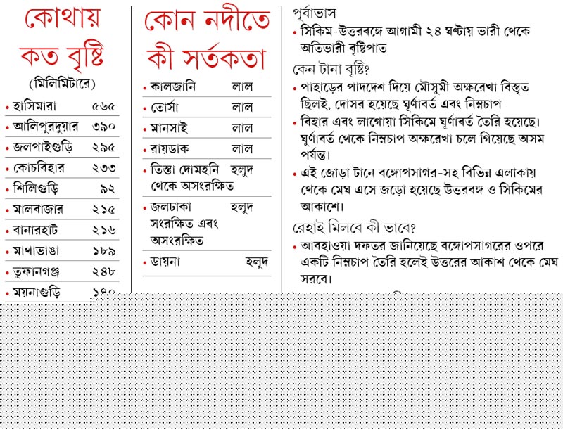 কোচবিহার শহর জুড়েও একই রকম জলছবি। শহরের ব্যস্ততম কেশব রোড থেকে স্টেশন রোড নদীর চেহারা নিয়েছে। সুনীতি রোড বাই লেন থেকে নতুন বাজার, কলাবাগান থেকে গাঁধীনগর শুধু জল আর জল। পরিস্থিতির জেরে কিছু এলাকায় বাসিন্দারা ত্রাণ শিবিরে আশ্রয় নিয়েছেন। কল ডুবে যাওয়ায় শুরু হয়েছে পানীয় জলের সংকটও।শহরের রক্ষাকবচ বলে পরিচিত তোর্সার বাঁধ নিয়েও উদ্বেগ বেড়েছে। হাজরাপাড়া এলাকায় তোর্সার স্লুইস গেট চুঁইয়ে জল ঢুকতে শুরু করে। বাসিন্দারা বালির বস্তা দিয়ে তা আটকাতে নামার পর সেচ দফতরের কর্মীরা আসেন। প্রশাসনের এক কর্তা অবশ্য বলেন, ‘‘পরিস্থিতির দিকে নজর রাখা হয়েছে। উদ্বেগের ব্যাপার নেই।’’