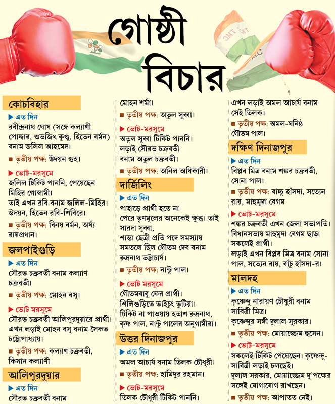 কয়েক মাস আগেই রামপাড়া চেঁচড়া অঞ্চলের তৃণমূলের উপপ্রধান তথা বিপ্লব মিত্র অনুগামী লুৎফর রহমান খুন হন। এই ঘটনায় সত্যেনবাবুর নাম জড়িয়ে, বিরুদ্ধ গোষ্ঠীর তৃণমূল কর্মীরা থানা পুলিশের পর উচ্চ আদালতেরও দ্বারস্থ হন। তা নিয়ে দু’পক্ষের বিবাদ অব্যাহত। বুধবার রাতে ফের সংঘর্ষ বাধে। উত্তপ্ত হয়ে ওঠে গোটা এলাকা। দলের প্রাক্তন জেলা সভাপতি বিপ্লব মিত্রের অভিযোগ, ‘‘তৃণমূলে যোগ দেওয়া কিছু নব্য সমর্থকদের নিয়ে পুরনো তৃণমূল কর্মীদের উপর হামলা করা হচ্ছে। উল্টে আমাদের বিরুদ্ধে মিথ্যা হামলার অভিযোগ করা হচ্ছে। পুলিশও ওদের কথা শুনে আমাদের লোকজনের বিরুদ্ধে পদক্ষেপ নিচ্ছে।’’ এলাকার বিদায়ী বিধায়ক সত্যেন রায়ের নাম না করে বিপ্লববাবুর আরও অভিযোগ, ‘‘নব্য তৃণমূলদের মদত দিয়ে পুরনোদের উপর হামলা করে আসলে দলটারই সর্বনাশ হচ্ছে।’’ আইএনটিটিইউসির জেলা সভাপতি তথা তৃণমূলের নন্দনপুর অঞ্চল সভাপতি মজিরুদ্দিন মন্ডল ঘটনায় নাম জড়ানোর পর জানান, তিনি স্ত্রীর চিকিৎসার জন্য গত দু’দিন ধরে শিলিগুড়িতে রয়েছেন। অথচ তাঁর বিরুদ্ধে মিথ্যা হামলার অভিযোগ করা হয়েছে।
