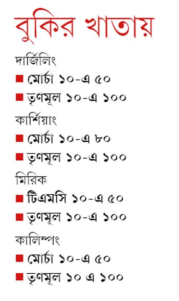 কার্শিয়াঙে মোর্চার পক্ষেই বাজি ধরার প্রবণতা বেশি। কিন্তু, কালিম্পঙে মোর্চা ক্ষমতা দখল করবে কি না, তার চেয়েও বেশি দরাদরি চলছে হরকাবাহাদুর ছেত্রীর জাপ ও তৃণমূলের মধ্যে কে কার চেয়ে বেশি আসন পাবে, তা নিয়ে।