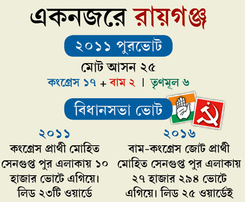 রায়গঞ্জেও বসে নেই শাসক দল। এখানে পুরসভার মেয়াদ শেষ হচ্ছে আগামী ২২ জুলাই। রাজ্য সরকারের প্রস্তাব মেনে তাই জুলাই মাসের দ্বিতীয় সপ্তাহের মধ্যে নির্বাচন কমিশন পুরভোটের বিজ্ঞপ্তি জারি করতে পারে বলে প্রশাসনিক সূত্রের খবর। এই অবস্থায় কংগ্রেস ও বামফ্রন্ট সিদ্ধান্ত নিয়েছে, তারা জোট করেই এই ভোটে লড়বে। সম্প্রতি কংগ্রেস ও বামফ্রন্টের উত্তর দিনাজপুর জেলা নেতারা ঘরোয়া বৈঠকে এই সিদ্ধান্ত নিয়ে ফেলেছেন।