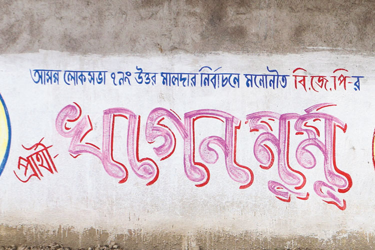গাজল ব্লকের সালাইডাঙা গ্রাম পঞ্চায়েতের সিস পিরালু গ্রাম। টাঙন নদী ঘেঁষা গ্রামটি। গ্রামে রাস্তা নেই বললেই চলে। জমির আলের মতো রাস্তা দিয়ে যাতায়াত করতে হয় গ্রামবাসীদের। সেখানেই মিলবে দেওয়ালটি যেখানে স্পষ্ট হয়ে রয়েছে, ‘বামপ্রার্থী খগেন মুর্মুকে ভোট দিয়ে জয়ী করুন লোকসভা নির্বাচনে’। এমনই দেওয়াল চোখে পড়বে মালদহের পুকুরিয়াতেও। ফলে পুরোনো এবং নতুন দেওয়াল লিখন নিয়ে বিভ্রান্তি তৈরি হয়েছে সাধারণ মানুষের মধ্যে।