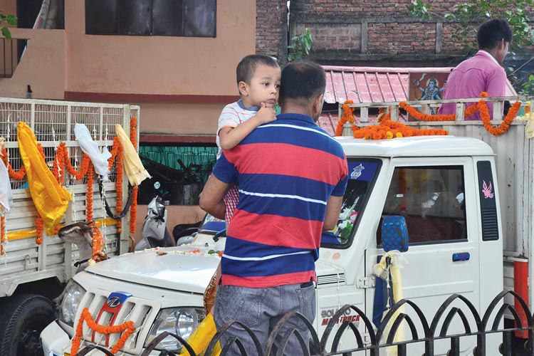শূন্যদৃষ্টি: জেঠুর কোলে চড়ে কুশওয়া দম্পতির ছেলে বিভান। নিজস্ব চিত্র