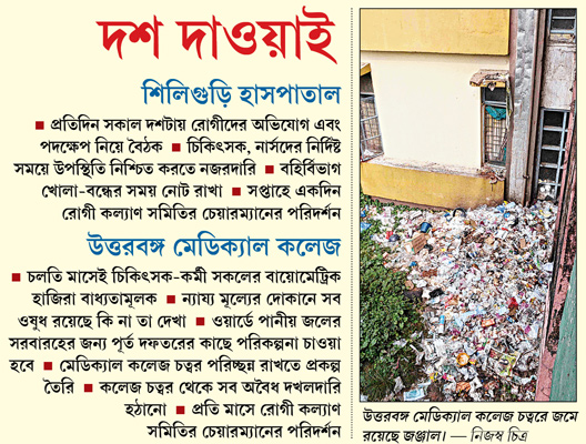 অন্য দিকে, এ দিন দুপুরে উত্তরবঙ্গ মেডিক্যাল কলেজ হাসপাতালের রোগী কল্যাণ সমিতির বৈঠকে গত পাঁচ বছরের নানা সুপারিশের তালিকা এবং পদক্ষেপের খতিয়ান তলব করেছেন চেয়ারম্যান গৌতমবাবু। নানা অনিয়মে যে সব কর্মী-নার্স-চিকিৎসকের বিরুদ্ধে পদক্ষেপ গ্রহণের কথা ছিল, তার কতটা হয়েছে— তারও রিপোর্ট চাওয়া হয়েছে। মন্ত্রী জানিয়েছেন, চলতি মাসের মধ্যেই এই রিপোর্ট দিতে বলা হয়েছে। আগামী মাসে নবান্নে উত্তরবঙ্গ মেডিক্যাল কলেজ নিয়ে উচ্চ পর্যায়ের