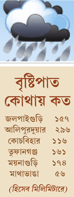 কেন্দ্রীয় আবহাওয়া দফতর সূত্রে জানানো হয়েছে, কিছুদিন ধরেই বঙ্গোপসাগর থেকে উত্তরবঙ্গের দিকে জলীয় বাষ্প আসতে শুরু করেছিল। বিক্ষিপ্তভাবে বৃষ্টি হলেও কোনও নিম্নচাপ বা ঘূর্ণাবর্ত না থাকায় কয়েক পশলার বেশি বৃষ্টি হয়নি। মঙ্গলবার বিকেলের পর থেকে একটি সিকিমের আকাশের উপরে একটি নিম্নচাপ সক্রিয় হওয়াতেই টানা বৃষ্টি শুরু হয়। পাহাড় এবং সমতল দু’জায়গাতেই বৃষ্টি হওয়ায় ডুয়ার্সের নদীগুলির জল বাড়লেও বিপদসীমার অনেকটাই নীচ দিয়ে বয়েছে। দু’দিন আগে তিস্তা নদীর দোমহনি থেকে বাংলাদেশ পর্যন্ত জারি করা হলুদ সঙ্কেত এ দিনও ছিল। অন্য নদীগুলিতে কোনও সঙ্কেত নেই বলে বুধবার বিকেলে সেচ দফতর সূত্রে জানানো হয়েছে।