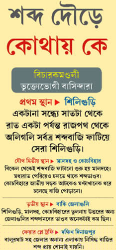 শিলিগুড়ির শব্দদৈত্যের তাণ্ডব ছাপিয়ে গেল উত্তরবঙ্গের অন্য জেলাগুলিকে। রবিবার বিকাল গড়িয়ে সন্ধ্যা হতেই শুরু হয়ে যায় শব্দবাজির দাপাদাপি। চার্চরোড, সেবক রোড থেকে পঞ্জাবিপাড়া, হাকিমপাড়া, আশ্রমপাড়া, দুইমাইল, খালপাড়া, নয়বাজার, স্টেশন ফিডার রোড, প্রধাননগর এলাকায় বাজির আওয়াজে কাঁপতে থাকে। সন্ধ্যা ৭টা থেকে রাত ১টা অবধি শহরের কানপাতাই দায় হয়ে পড়ে। পুলিশের ভ্যানের দৌড়াদৌড়ি থাকলেও রাস্তার বদলে বাড়ির ছাদ, ব্যালকনি বা ভিতরে বাজি ফাটানো চলে থাকে। আকাশের রং লাল, হলুদ, সবুজ বদলাতে থাকে। সঙ্গে প্রচণ্ড শব্দ। অনেক এলাকায় পাশাপাশি বাড়ির ছাদ থেকে চলে বাজি ফাটানোর প্রতিযোগিতা। অনেকেই একে কারগিলের যুদ্ধ বা সার্জিক্যাল অ্যাটাক হচ্ছে, তা বলেও বিদ্রুপ করেন। প্রবীণেরা তো বটেই কচিকাঁচারাও টানা শব্দে অস্বস্তি বোধ করেন। বেশ কিছু এলাকায় রাস্তায় আটকেও বাজি ফাটানোর ধুম দেখা দিয়েছে। পুলিশের দাবির পরেও শহর জুড়ে এত শব্দবাজি কী ভাবে ঢুকে বিক্রি হল তা নিয়ে প্রশ্নও তুলেছেন বহু বাসিন্দা। মণ্ডপের ধুপধুনো, মিঠাইয়ের দোকানের ঘি-কড়াপাকের গন্ধ উধাও শিলিগুড়ির হাকিমপাড়া হোক বা সুভাষপল্লি রাত বারোটার আগে থেকেই বাতাসে বারুদের ঘ্রাণ। নাগাড়ে বাজি পোড়ায় বাতাস জুড়ে বারুদ ভাসছে। শুধু বারুদের ঘ্রাণ নয়, শব্দবাজির টানা শব্দে খালপাড়া-নয়াবাজার, শক্তিগড়, স্টেশন ফিডার রোডের এলাকায় প্রায় যুদ্ধ পরিস্থিতি। নিষিদ্ধ চকোলেট বোমের শব্দ যেন পেটো, বাক্সবোমার শব্দের সঙ্গে তুলনা হতে পারে গ্রেনেডকে। রাত দশটার পরে শব্দবাজি দিয়ে যেন ‘এলাকা দখল’ নেওয়ার পালা চলে। রাস্তার এক দিকের সঙ্গে অন্যদিকের বাজি ছুড়ে লড়াই, এমনকী বহুতলগুলির মধ্যে যেন বাজি পোড়ানো নিয়ে প্রতিযোগিতা চলছিল।