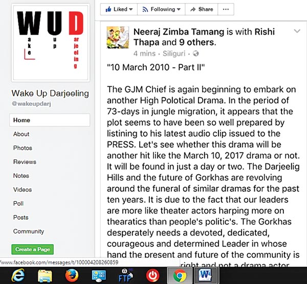 এ দিন দুপুরে মোর্চার চিফ কো-অর্ডিনেটর বিনয়ের নেতৃত্বে মোর্চার ৫ সদস্যের প্রতিনিধি দল কলকাতা রওনা হন। তার কয়েক ঘণ্টা আগে সকালে ‘ওয়েক আপ দার্জিলিং’ বলে একটি ফেসবুক পেজে জিএনএলএফের মুখপাত্র নীরজ জিম্বা তামাঙ্গ মোর্চা সভাপতির নাম না করে তাঁকে আক্রমণ করেন। তাঁর দাবি, গুরুঙ্গ রাজনৈতিক নাটক করছেন। তাঁর সেই ফেসবুক পোস্ট শেয়ার করা হয়। সেখানে নীরজ পাহাড়ের নতুন নেতা দরকার বলেও মন্তব্য করেন। তার পরেই ফেসবুকে অনেকে মন্তব্য করতে থাকেন যে, পাহাড়ে বিদ্বজ্জন নেতা প্রয়োজন, দার্জিলিং পাহাড়ের ‘সব থেকে খারাপ জিনিস গুরুঙ্গ’, ‘নাটকবাজ নেতা’র আর প্রয়োজন নেই বলে কমেন্ট পড়তে শুরু করে। এমনকি, বিমল গুরুঙ্গ চেয়ার বাঁচাতে এ সব করছেন বলেও মন্তব্য করা হয়। বিকেল থেকে মোর্চার অন্দরে বিষয়টি নিয়ে জোর আলোচনা শুরু হয়। বিমল গুরুঙ্গে অফিশিয়াল ফেসবুক অ্যাকাউন্টের টাইমলাইনে পোস্টটি দুপুর অবধি থাকলেও সন্ধ্যায় তা সরিয়ে দেওয়া হয় বলে অভিযোগ। দলের সাধারণ সম্পাদক রোশন গিরি থেকে কোনও নেতাই এ নিয়ে কোনও মন্তব্য করেননি।