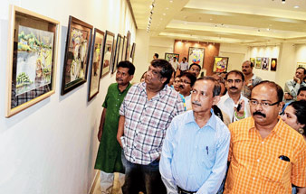 রামকিঙ্কর প্রদর্শনী কক্ষে চিত্র প্রদর্শনী দেখছেন গৌতম দেব ও কৌশিক গঙ্গোপাধ্যায়। নিজস্ব চিত্র।
