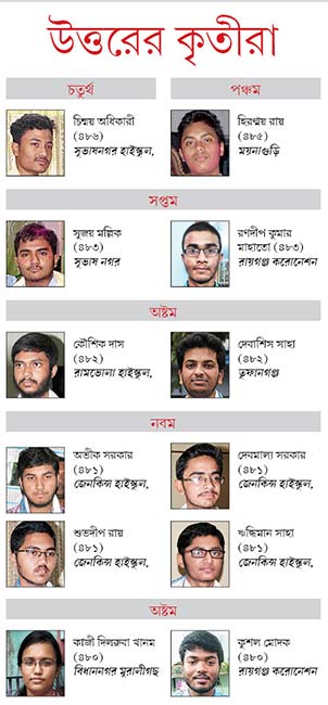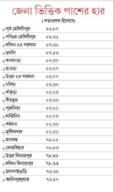 উত্তরবঙ্গের জেলাগুলির মধ্যে পাসের হার তুলনামূলক ভাবে বেশি দার্জিলিং জেলায়। পাহাড়-তরাইয়ের এই জেলায় পাসের হার ৮২.৭৪ শতাংশ। রাজ্যের নিরিখে তৈরি তালিকায় সর্ব নিম্নে রয়েছে উত্তরের দুই জেলা। জলপাইগুড়ি এবং আলিপুরদুয়ার। এই দুই জেলাতেই ৭৪ শতাংশের কিছু বেশি পরীক্ষার্থী পাস করেছে। এ বছর উচ্চ মাধ্যমিকের মেধা তালিকায় জায়গা করে নিয়েছে শিলিগুড়ি লাগোয়া বিধাননগর মুরালীগছ স্কুলের দিলরুবা খানম। প্রত্যন্ত এলাকার একটি স্কুলের নাম রাজ্যের সেরাদের মধ্যে চলে আসার তাৎপর্যও রয়েছে বলে শিক্ষকদের একাংশ দাবি করছে। প্রত্যন্ত এলাকার ওই স্কুল বেশ কয়েক বছর ধরেই নানা পরিকাঠামো তৈরি করে নজর কেড়েছে। ক্লাসঘর-শিক্ষক কোনও কিছুরই অভাব তেমন প্রকট নয় বলে স্কুলের তরফে দাবি করা হয়েছে। মুরালীগছ স্কুলের প্রধান শিক্ষক সামসুর আলম বলেন, ‘‘প্রশ্নটা হল পরিকাঠামোর। যদি সঠিক পরিকাঠামো থাকে তবে ভাল ফল মিলবেই।’’