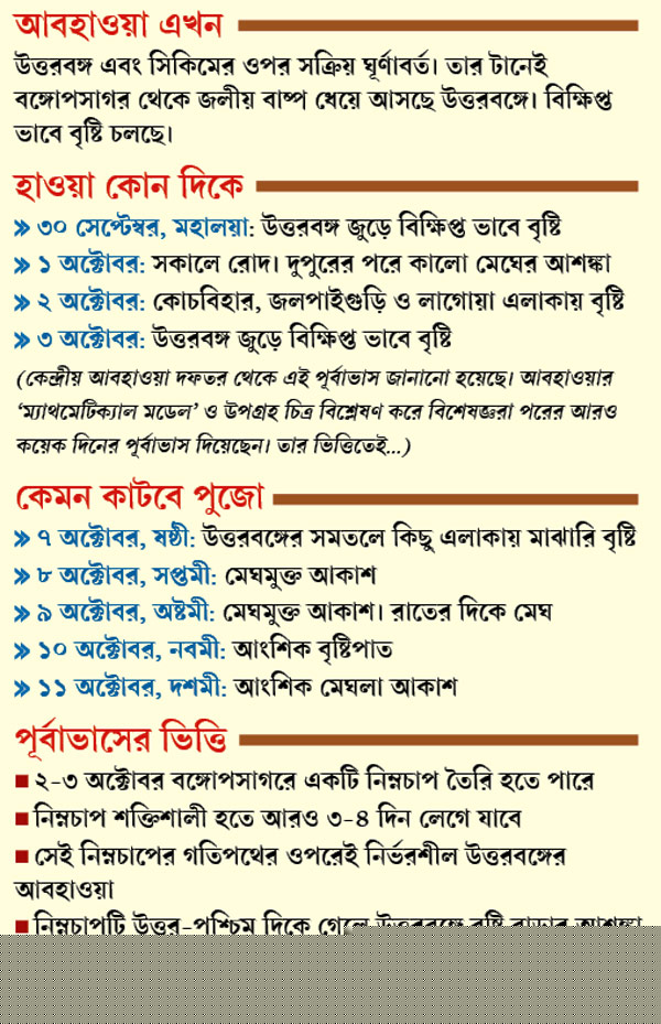 হাওয়া অফিসের পূর্বাভাস বলছে, উত্তরবঙ্গে একটি ঘূর্ণাবর্ত সক্রিয়। যার টানে বঙ্গোপসাগর থেকে জলীয় বাষ্প ধেয়ে আসছে উত্তরে। তাই সাময়িক স্বস্তি মিললেও, নিশ্চিন্ত হতে পারছেন না কেউই।