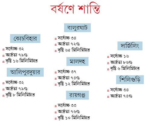 কয়েক দিন ধরে মালদহের তাপমাত্রা ৩৯ ডিগ্রির আশেপাশে ঘোরাফেরা করছিল। বেলা ১১টা নাগাদ বৃষ্টি নামলে এক ধাক্কায় তাপমাত্রার পারদ ৯ ডিগ্রি কমে যায়। বালুরঘাটের রেকর্ড পরিমাণ বৃষ্টি হয়েছে। সকাল থেকে অন্তত ৫০ মিলিমিটার বৃষ্টি হয়েছে দক্ষিণ দিনাজপুরের সদরে।