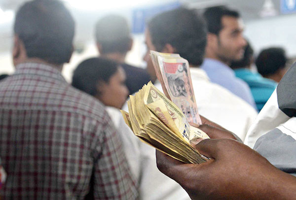 সকাল থেকে ব্যাঙ্কের লাইনে নোটের তাড়া হাতে জলপাইগুড়িতে। ছবি: সন্দীপ পাল।