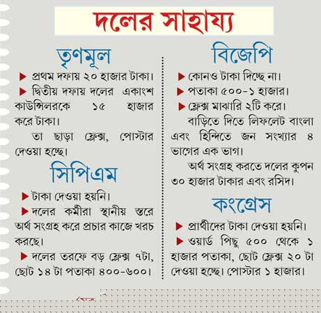 বিভিন্ন রাজনৈতিক দলের একাংশের তরফে প্রার্থীদের আর্থিক-সহযোগিতা, ফ্লেক্স, পতাকা দিয়ে সাহায্য করা হচ্ছে। সিপিএম, বিজেপি বা কংগ্রেস দাবি করেছে, তাদের প্রার্থীদের তারা কোনও টাকা দেননি। পতাকা, ফ্লেক্স, পোস্টারের মতো সামগ্রী দিয়ে সাহায্য করা হয়েছে বলে জানান তাঁরা। তৃণমূলের তরফে জানানো হয়, তাদের প্রার্থীদের একাংশকে ২০ হাজার টাকা এবং পরে কিছু প্রার্থীকে আরেক দফায় ১৫ হাজার টাকা করে প্রচার খরচ দেওয়া হযেছে। জনা তিনেক প্রার্থী সেই টাকাও নেননি। অনেককে দেওয়া হচ্ছে ফ্লেক্স, পোস্টারও। অথচ তৃণমূলের বেশ কিছু ওয়ার্ডে প্রার্থীদের প্রচার খরচ দলের তরফে দেওয়া টাকার ২০/৩০ গুণ বেশি। কোথা থেকে খরচ আসছে? প্রার্থীদের দাবি, শুভানুধ্যায়ী, পরিচিতেরা অনেকে ফ্লেক্স, পোস্টার ছাপিয়ে দিয়ে সাহায্য করছেন। তাতেই বেশি খরচ হচ্ছে বলে মনে হচ্ছে।