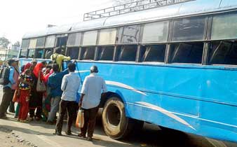 সরকারি বাসে উঠতে যাত্রীদের ভিড়। সোমবার তোলা নিজস্ব চিত্র।