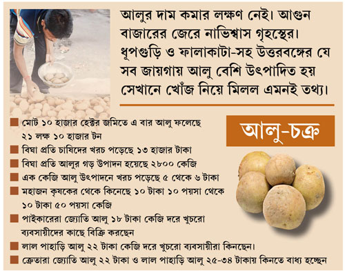 উত্তরবঙ্গের অন্যতম আলু চাষের জায়গা ধূপগুিাড়র চাষিরা কী বলছেন দেখা যাক। সেখানে খুচরো বাজারে বর্তমানে জ্যোতি আলু ২২ টাকা এবং লাল পাহাড়ি আলু ২৬ থেকে ২৮ টাকা কেজি। উত্তরবঙ্গ আলু ব্যবসায়ী সমিতির সম্পাদক কার্তিক দাসের দাবি, “আলুর কোনও কালোবাজারি হচ্ছে না। সরকারি নিষেধাজ্ঞার জন্য ভয়ে অনেকে হিমঘর থেকে আলু বের করছেন না। সে জন্য দাম বাড়ছে। আমরা কৃষকদের থেকে ১৩ টাকা ২৫ পয়সা দরে আলু কিনেছি। হিমঘর ভাড়া-সহ কয়েকটি খরচ মিলিয়ে আমাদের কেজি প্রতি আলু ১৬ টাকা ৫৫ পয়সা পড়েছে।”