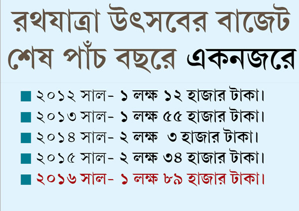 দেবোত্তর সূত্রে জানা গিয়েছে, বোর্ডের আর্থিক অনটনের জেরে ওই সিদ্ধান্ত নেওয়া হয়েছে। গত বছর যেখানে রথযাত্রার বাজেট ধরা হয়েছিল ২লক্ষ ৩৪ হাজার ১৭৪ টাকা। এবার সেটাই কমিয়ে করা হয়েছে ১ লক্ষ ৮৯ হাজার ৩৫৮ টাকা। গত পাঁচ বছরের নিরিখে এটাই সবচেয়ে কম। ফলে এ বার জাঁকজমকের আতিশয্যে কিছুটা কোপ পড়ার সম্ভবনা তৈরি হয়েছে। দেবোত্তর কর্তৃপক্ষের অবশ্য, বিকল্প আয় বাড়ানোর ব্যাপারে পরিকল্পনা হয়েছে। ট্রাস্ট বোর্ডের সদস্য তথা কোচবিহারের সদর মহকুমাশাসক অরুন্ধতী দে বলেন, “পরম্পরা ও সমস্ত রীতি মেনেই রথযাত্রা উৎসবের পরিকল্পনা নেওয়া হয়েছে। বাজেট কিছুটা কমানো হয়েছে।”