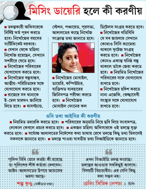 তবে পুলিশের অন্দরের খবর, একজন মহিলা হারিয়ে যাওয়ার পরে থানায় নিখোঁজ সংক্রান্ত ডায়েরি হলে কী পদক্ষেপ করতে হবে, তার স্পষ্ট নির্দেশ রয়েছে। ২০১১ সালে রাজ্য পুলিশের সদর দফতর থেকে এক নির্দেশনামা সব থানায় পাঠানো হয়েছে। প্রতিটি মিসিং ডায়েরির ক্ষেত্রে সেই মতো পদক্ষেপ করতে হবে। সঙ্গীতা অন্তর্ধানের মামলায় গোড়া থেকে সেই সব পদক্ষেপ ভক্তিনগর থানা কতটা করেছে, আর কতটা কেন করেনি তা নিয়ে আগেই প্রশ্ন উঠেছে। পুলিশের সদর দফতরেও সেই অভিযোগ পৌঁছেছে। তবে ভক্তিনগর তানার কয়েকজন অফিসার জানান, তাঁদের পক্ষ থেকে বিধি মেনে সব পদক্ষেপ করা হয়েছে।