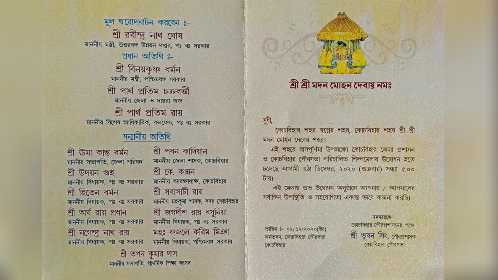 নাম না থাকা নিয়ে কোচবিহার পৌরসভার প্রশাসক ভূষণ সিংহ জানান, আমন্ত্রণ পত্রে নাম দিতে হলে বিধায়কের বা সংসদের অনুমতির প্রয়োজন হয়। অনেক বার চেষ্টা করা হলেও বিধায়ক মিহির গোস্বামী এবং সাংসদ নিশীথ প্রামাণিকের সঙ্গে যোগাযোগ করা যায়নি। তাই তাঁদের নাম আমন্ত্রণ পত্রে রাখা হয়নি। এর সঙ্গে রাজনীতির কোনও সম্পর্ক নেই।