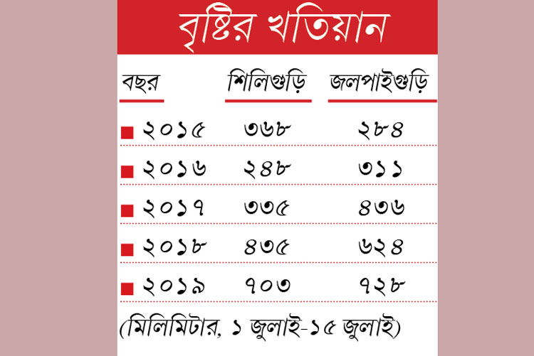 দফতরের হিসাব বলছে, জুলাইয়ের প্রথম দুই সপ্তাহে শিলিগুড়িতে বৃষ্টি হয়েছে ৭০৩ মিলিমিটার। আর জলপাইগুড়িতে বৃষ্টি হয়েছে ৭২৮ মিলিমিটার। কেন্দ্রীয় আবহাওয়া দফতরের পর্যবেক্ষণ করার স্টেশনগুলোর তথ্য নিয়ে তা খতিয়ে দেখার পরে এমনই হিসাব এসেছে। ডুয়ার্স, সিকিম, দার্জিলিং, কালিম্পংয়েও বৃষ্টি বেড়েছে। স্বাভাবিকের থেকে ৫৫-৬০ শতাংশ বেশি বৃষ্টি হয়েছে। কেন্দ্রীয় আবহাওয়া দফতরের আধিকারিক গোপীনাথ রাহা বলেন, ‘‘জুলাইয়ের প্রথমে শিলিগুড়ি ও জলপাইগুড়ি শহরে গত ১৫ বছরে টানা এতটা বৃষ্টি হয়নি।’’