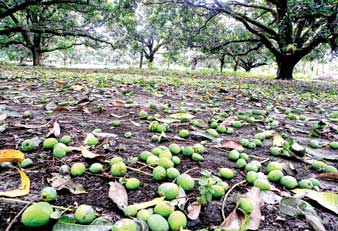 শনিবার রাতে ঝড়ে পড়ে গিয়েছে আম। মালদহের চাঁচলে বাপি মজুমদারের তোলা ছবি।