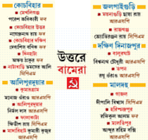 দক্ষিণ দিনাজপুরের ছ’টি বিধানসভা আসনের মধ্যে এখনও পর্যন্ত বামেরা চারটি আসনে প্রার্থী ঘোষণা করেছে। দু’টি আসন বন্টন নিয়ে এখনও কংগ্রেসের সঙ্গে তাদের আলোচনা জারি রয়েছে বলে দল সূত্রের খবর। এই পরিস্থিতির কথা ভেবে সিপিএমের রাজ্য সম্পাদক সূর্যকান্তবাবু প্রকাশ্য ভাষণে বলেন, ‘‘আসন নিয়ে নেতারা আলোচনা করছেন। হয়তো এঁর সঙ্গে তাঁর বোঝাপড়া হচ্ছে না। শেষে তোমার-আমার লড়াইয়ের ফলে দেখা যাচ্ছে, আসনটিতে তৃণমূল জিতে যাবে। সেখানে একপক্ষকে বসে যেতে হবে।’’