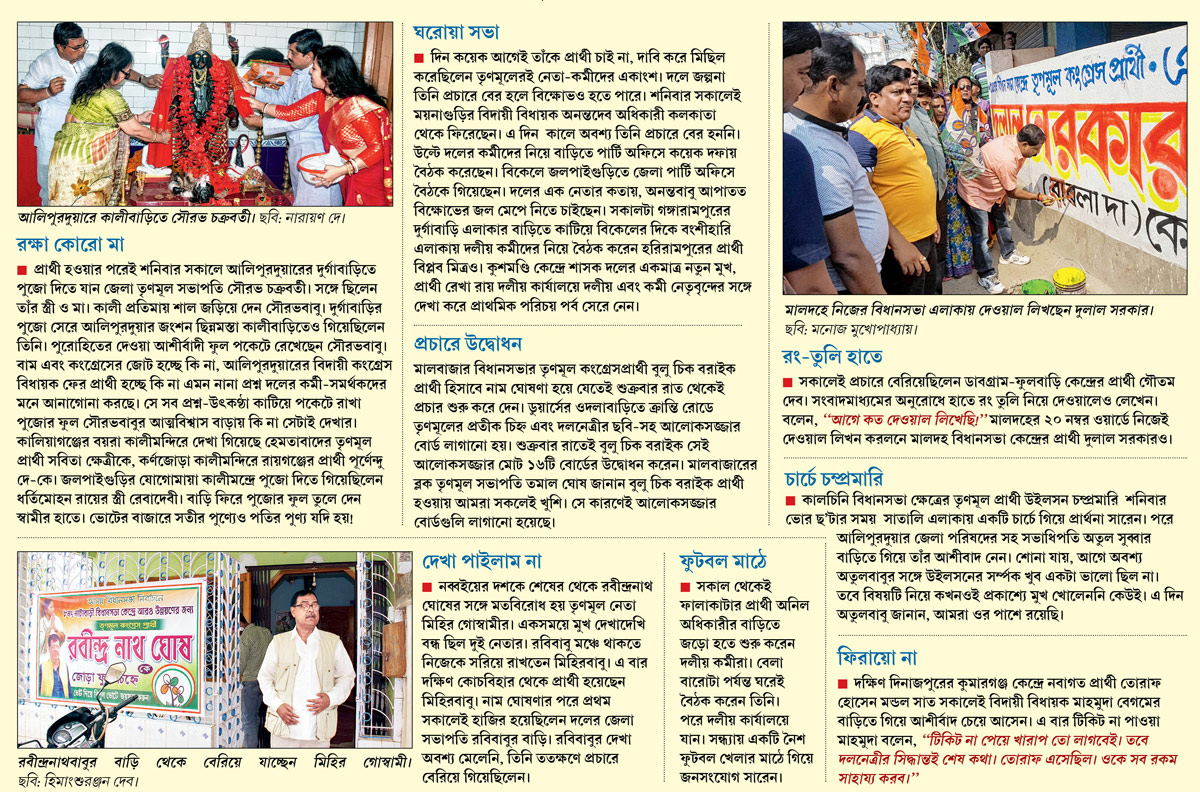 কেউ মন্দিরে-চার্চে। কেউ বা ফুটবল মাঠে। কেউ বা একসময়ে ‘মুখ দেখব না’ পণ করে থাকা জেলা সভাপতির বাড়ির দরজায় কড়া নেড়েছেন। কোনও প্রার্থী আবার বিক্ষোভের ভয়ে রাস্তায় না নেমে পার্টি অফিসেই বৈঠক সেরেছেন। নবাগত কেউ আবার টিকিট না পেয়ে মনঃক্ষুণ্ণ বিদায়ী বিধায়কের আশীর্বাদ নিয়ে দিন শুরু করেছেন। তোর্সাপাড়ের কোচবিহার থেকে মহানন্দাপাড়ের শিলিগুড়ি— শনিবার তৃণমূল প্রার্থীদের এমন চিত্রই দেখল উত্তরবঙ্গ। উঁকি দিল আনন্দবাজার।