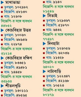 শীতলখুচি কেন্দ্রে অবশ্য হিতেনবাবু সূক্ষ্মভাবে খেলে ব্যবধান তৈরি করেছেন ৮১ হাজার ৫৪৬ ভোটের। যা টপকানো আর কারও পক্ষে সম্ভব হয়নি। সিতাই বিধানসভা থেকে তৃণমূলের ব্যবধান ছিল ৭৭ হাজার ৪৯৭ ভোট। মাথাভাঙা থেকে ৪৪ হাজার ৪৫২, কোচবিহার দক্ষিণ ৩৩ হাজার ৯৩৩ ভোটে ব্যবধান পায়। কোচবিহার উত্তর বিধানসভা কেন্দ্র থেকে ৩১ হাজার ২১৪ ভোটে এ বারে এগিয়ে তৃণমূল। ওই কেন্দ্রে গত বিধানসভা নির্বাচনে ১৩ হাজার ভোটে বাম প্রার্থীর কাছে হেরে যায় তৃণমূল। ওই কেন্দ্রের গত বিধানসভায় তৃণমূলের পরাজিত প্রার্থী পরিমল বর্মন বলেন, “এবারে অনেক ভাল ফল হয়েছে আমাদের।”