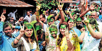 পুরভোটে জয়ের পরে তৃণমূল কর্মী-সমর্থকদের উল্লাস জলপাইগুড়িতে। ছবি: সন্দীপ পাল।