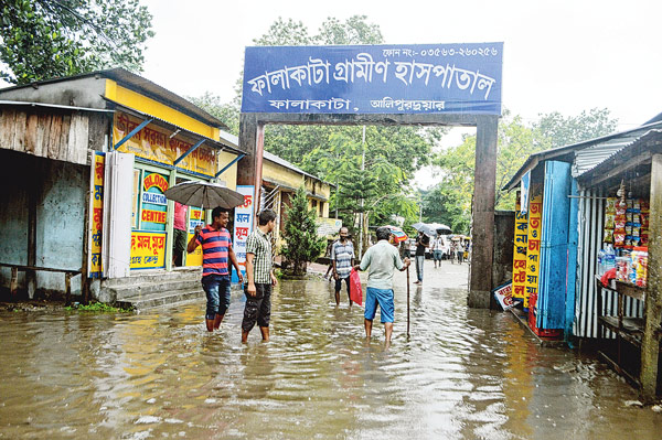 সোমবার গভীর রাতের পর থেকে ফালাকাটা হাসপাতালে ঢোকাই দায় হয়ে পড়ে। হাসপাতালে ঢোকার মূল গেট এবং বর্হিবিভাগে ঢোকার রাস্তায় প্রায় হাঁটু সমান জল জমে যায়। জলের তোড়ে রিকশা ভ্যান ঢোকা বন্ধ।