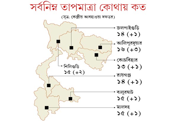 কেন্দ্রীয় আবহাওয়া দফতরের ঘোষণা অনুযায়ী দেশে শীতের আনুষ্ঠানিক প্রবেশ হয়েছে। যদিও শিলিগুড়ি থেকে মালদহ সর্বনিম্ন তাপমাত্রা এখনও কিছুটা বেশি। বাসিন্দাদের একাংশের দাবি, সকালে একটা হাল্কা সোয়েটার চাপালে বেলা বাড়তেই তা খুলে ফেলতে হচ্ছে। আবহাওয়া-কর্তাদের দাবি, সর্বনিম্ন তাপমাত্রার খুব একটা হেরফের হয়নি। স্বাভাবিকের থেকে এক বা দু ডিগ্রি বেশি-কমের তারতম্যকে স্বাভাবিক বলেই ধরা হয়। তবে বাতাসে যে কনকনে ভাব নেই, তা মানছেন তাঁরা। কেন্দ্রীয় আবহাওয়া দফতরের সিকিমের আধিকারিক গোপীনাথ রাহা বলেন, ‘‘পশ্চিমী ঝঞ্ঝার অনুপস্থিতিতেই উষ্ণতা একটু বেশি। ঝঞ্ঝা এলে তার টানে উত্তুরে হাওয়াও ঢুকবে। জাঁকিয়ে শীত পড়বে।’’
