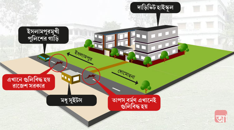 শুক্রবার সকালে ওই দোকানের সামনেই দেখা গেল চাপ চাপ রক্ত। ঠিক ওই জায়গাতেই পড়ে ছিল ইসলামপুর কলেজের ছাত্র তাপস বর্মণের রক্তাক্ত গুলিবিদ্ধ দেহ। দোকানটা তাপসদেরই। প্রত্যক্ষদর্শীদের দাবি, তাপস বৃহস্পতিবার খণ্ডযুদ্ধের সময়ে রাস্তার উপর দাঁড়িয়েছিল। তখনই গুলিটা তার পেটের বাঁদিক ফুঁড়ে বেরিয়ে যায়। পাশে দাঁড়িয়ে ছিল বিপ্লব সরকার নামে আরও এক তরুণ। পায়ে গুলি লাগে তারও। সেখান থেকে প্রায় ১০০ মিটার দূরে ইসলামপুরের দিকে রাস্তার উপর গুলিবিদ্ধ হয় আইটিআই ছাত্র রাজেশ সরকার।