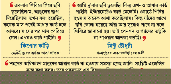 সমস্যা মেটাতে বাড়তি শিবিরের বন্দোবস্ত হয়েছিল খড়্গপুরে। কিন্তু লাভ হয়নি তাতে। শহরের ৭ নম্বর ওয়ার্ডের বাসিন্দা অবসরপ্রাপ্ত রেলকর্মী মিন্টু চৌধুরী বললেন, “আমি দু’বার ছবি তুলেছি। কিন্তু এখনও আধার কার্ড পাইনি। ইন্টারনেটেও কার্ড মেলেনি। ওয়ার্ডে শিবির হওয়ায় অনেক আশা করেছিলাম। কিন্তু যাঁদের আগে ছবি তোলা হয়েছে তাঁরা আর সুযোগ পাবে না বলে শিবিরে জানানো হয়। তাই পেনশন ও গ্যাসের ভর্তুকি না পাওয়ার আশঙ্কা করছি।”