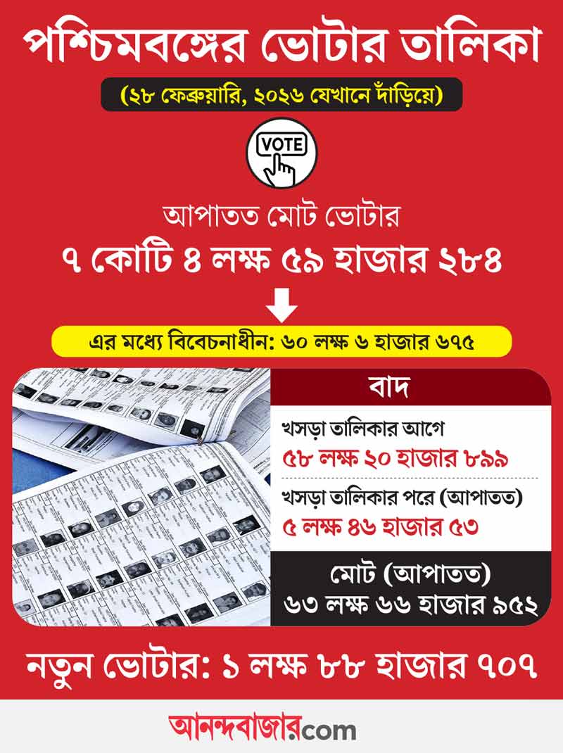 গত বছর ২৭ অক্টোবর ভোটার তালিকার বিশেষ নিবিড় সংশোধনের কথা জানিয়েছিল কমিশন। তখন রাজ্যে মোট ভোটার ছিল ৭ কোটি ৬৬ লক্ষ ৩৭ হাজার ৫২৯। এনুমারেশন ফর্ম বিলি এবং জমা নেওয়ার পর্ব শেষে গত ১৬ ডিসেম্বর খসড়া তালিকা প্রকাশিত হয়। ওই তালিকা থেকে বাদ যায় ৫৮ লক্ষ ২০ হাজার ৮৯৯ জনের নাম। তালিকায় নাম ওঠে ৭ কোটি ৮ লক্ষ ১৬ হাজার ৬৩০ জনের। এ বার শনিবার প্রকাশিত চূড়ান্ত তালিকা (অসম্পূর্ণ) থেকে আপাতত বাদ গেল ৫ লক্ষ ৪৬ হাজার ৫৩ জনের নাম।