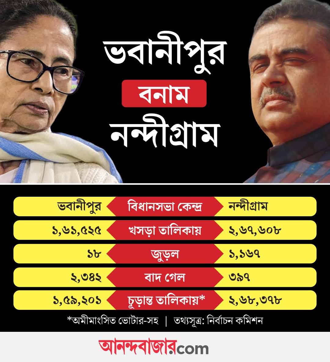 খসড়া তালিকার তুলনায় ভোটার সংখ্যা আপাতত বাড়ল নন্দীগ্রামে। খসড়া তালিকার চেয়ে ৭৭০ জন ভোটারের নাম বৃদ্ধি পেয়েছে সেখানে। অন্য দিকে, ভবানীপুর বিধানসভা কেন্দ্রে খসড়া তালিকার তুলনায় কমেছে ২,৩২৪ জন ভোটার। রাজ্য রাজনীতিতে এই দুই বিধানসভা কেন্দ্রই অন্যতম আলোচিত। এক দিকে, তৃণমূলনেত্রী মমতা বন্দ্যোপাধ্যায়ের বিধানসভা কেন্দ্র ভবানীপুর। অন্য দিকে, নন্দীগ্রাম বিরোধী দলনেতা শুভেন্দু অধিকারীর বিধানসভা কেন্দ্র।