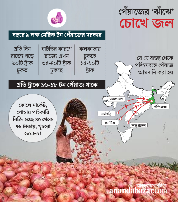 মহারাষ্ট্র ছাড়াও, কর্নাটক, অন্ধ্রপ্রদেশ, মধ্যপ্রদেশ থেকে এ রাজ্যে পেঁয়াজ আমদানি হয়। তা ছাড়া এ রাজ্যের বর্ধমান, হুগলি তো বটেই, এখন রাজ্যের বিভিন্ন জেলায় পেঁয়াজ উৎপাদন হচ্ছে। রাজ্যের এগ্রিকালচার টাস্ক ফোর্সের সদস্যও কমলবাবু। তাঁর দাবি, “বাজারে নজরদারির চালানোর জন্য এনফোর্সমেন্ট ব্রাঞ্চের ভূমিকা থাকাও জরুরি। সেটা ঠিক ভাবে হচ্ছে কি?’’ তাঁর কথায়: ‘‘প্রতি বছর রাজ্যে ৯ লক্ষ মেট্রিক টন পেঁয়াজের প্রয়োজন পড়ে। বাংলাতেও এখন ভাল ফলন হচ্ছে। কিন্তু সঠিক সংরক্ষণের কোনও পরিকল্পনা না থাকায় সেই ভিন্ রাজ্যের দিকেই তাকিয়ে থাকতে হয় আমাদের।” অনেক আড়তদার আবার হু হু করে পেঁয়াজের দাম বাড়ার জন্য রাজ্যের ভূমিকাকেও কাঠগড়ায় তুলছেন।