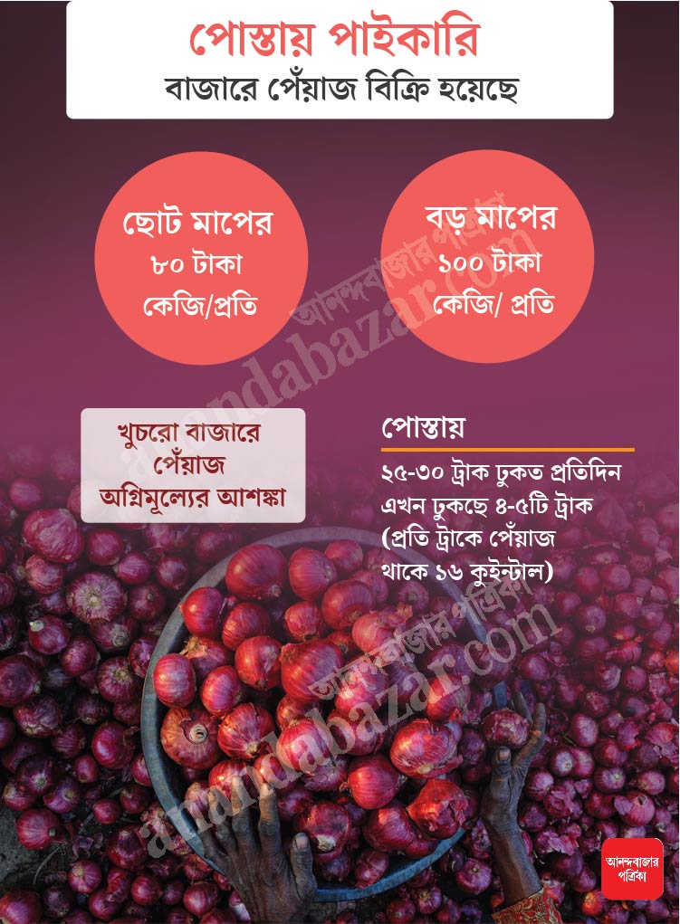 এ দিন পোস্তা-বড়বাজারে পাইকারি ভাবে পেঁয়াজ বিক্রি হয়েছে ৯০ থেকে ১০০ টাকায়। খুচরো বিক্রেতাদের মধ্যে যাঁরা ওই দামে পেঁয়াজ কিনেছেন, তাঁরা কত টাকায় পেঁয়াজ বিক্রি করবেন, তা নজরে রাখছে রাজ্য সরকারের টাস্ক ফোর্স এবং এনফোর্সমেন্ট ব্রাঞ্চ। নজরদারি চালানোর পরেও, আদৌ খুচরো বাজারে পেঁয়াজের দাম নিয়ন্ত্রণে রাখা যাবে কি না, তা নিয়ে সন্দিহান খোদ টাস্ক ফোর্সের কর্তাদের একাংশ।