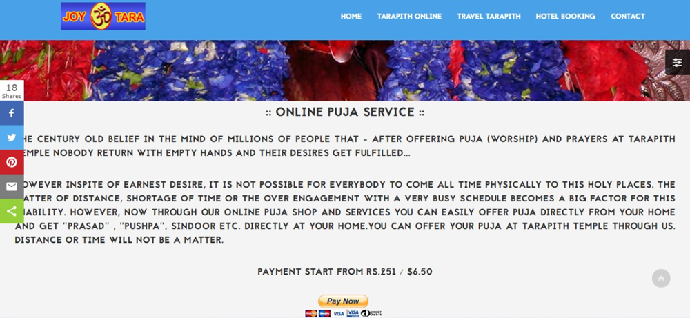 তারাপীঠ ডট কম, তারাপীঠ টেম্পল ডট ইন— এ রকমই ওয়েবসাইট। সাইটে ক্লিক করলেই খুলে যাবে তারাপীঠের তারা মন্দিরের বিগ্রহের বিশাল ছবি। তলায় অনলাইন পুজো দেওয়ার নানা রেট। ১৮ অগস্ট কৌশিকী অমাবস্যা। তার রেট আলাদা।