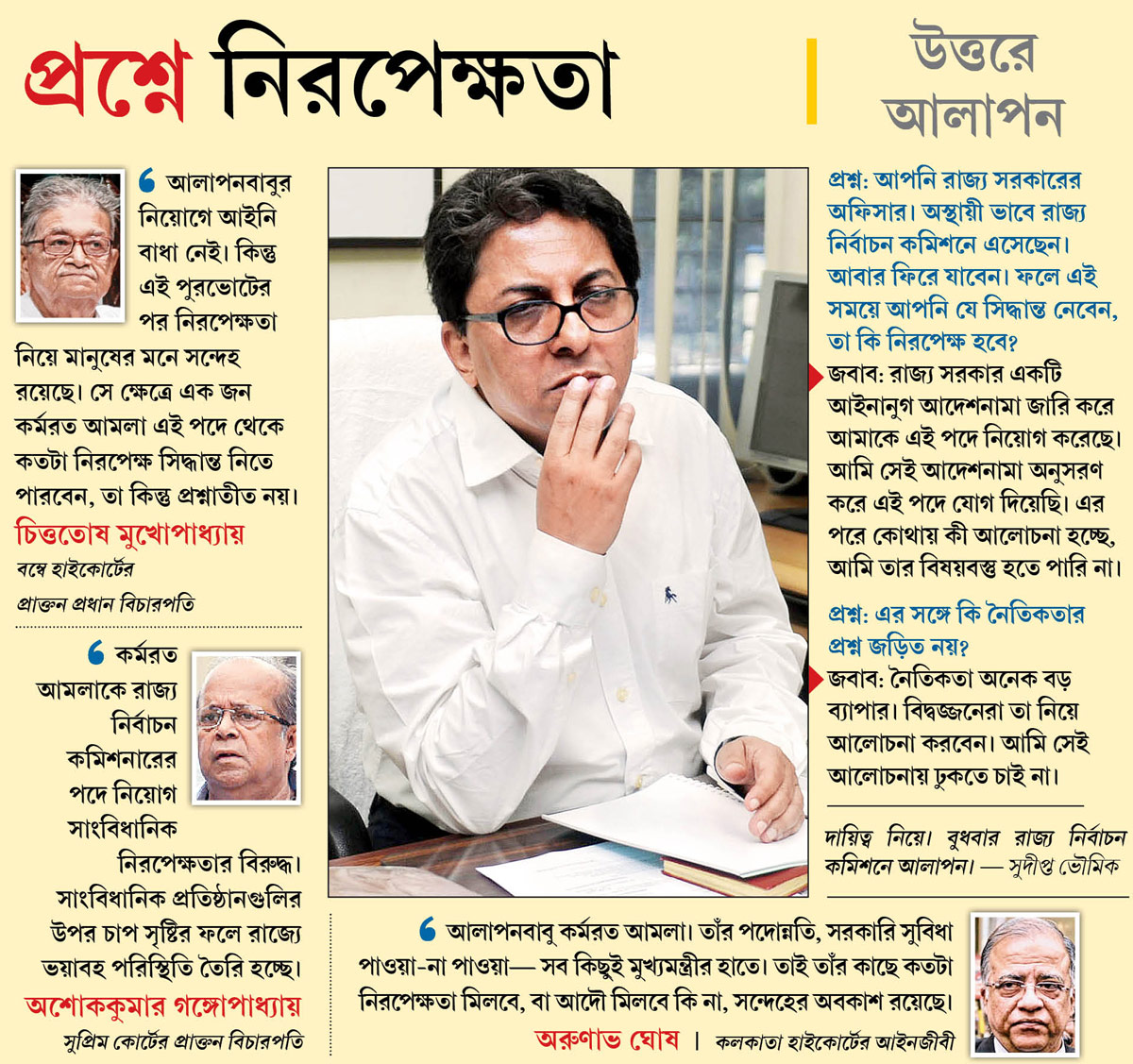 বম্বে হাইকোর্টের প্রাক্তন প্রধান বিচারপতি চিত্ততোষ মুখোপাধ্যায়ও বলেন, ‘‘আলাপনবাবুর নিয়োগে আইনি বাধা নেই। কিন্তু এই পুরভোটের নিরপেক্ষতা নিয়ে মানুষের মনে সন্দেহ রয়েছে। সে ক্ষেত্রে এক জন কর্মরত আমলা এই পদে থেকে কতটা নিরপেক্ষ সিদ্ধান্ত নিতে পারবেন, সেটাও কিন্তু প্রশ্নাতীত নয়। এ সময়ে নিরপেক্ষ হিসেবে মানুষের মনে বিশ্বাস তৈরি করাটাই মূল ব্যাপার।’’