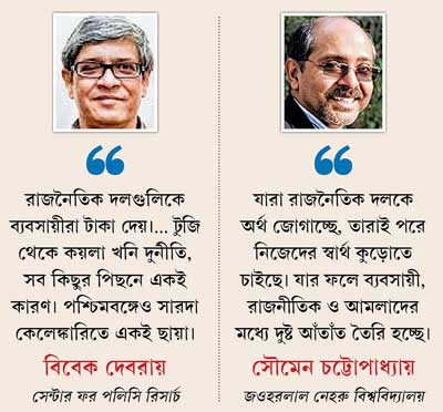 কী এই দুর্নীতির উৎস? বিবেকবাবুর বক্তব্য, “ভোটের সময় রাজনৈতিক দলগুলিকে ব্যবসায়ীরা টাকা দেয়। সেটা বন্ধ না হলে এই বৃহত্তর দুর্নীতির সমাধান করা যাবে না। টুজি থেকে কয়লা খনি দুর্নীতি, সব কিছুর পিছনে একই কারণ। পশ্চিমবঙ্গেও সারদা কেলেঙ্কারিতে একই ছায়া।” জওহরলাল নেহরু বিশ্ববিদ্যালয়ের অর্থনীতির অধ্যাপক সৌমেন চট্টোপাধ্যায় বলেছেন, “যারা রাজনৈতিক দলকে অর্থ জোগাচ্ছে, তারাই পরে নিজেদের স্বার্থ কুড়োতে চাইছে। যার ফলে এক শ্রেণির ব্যবসায়ী, রাজনীতিক ও আমলাদের মধ্যে দুষ্ট আঁতাঁত তৈরি হচ্ছে।”