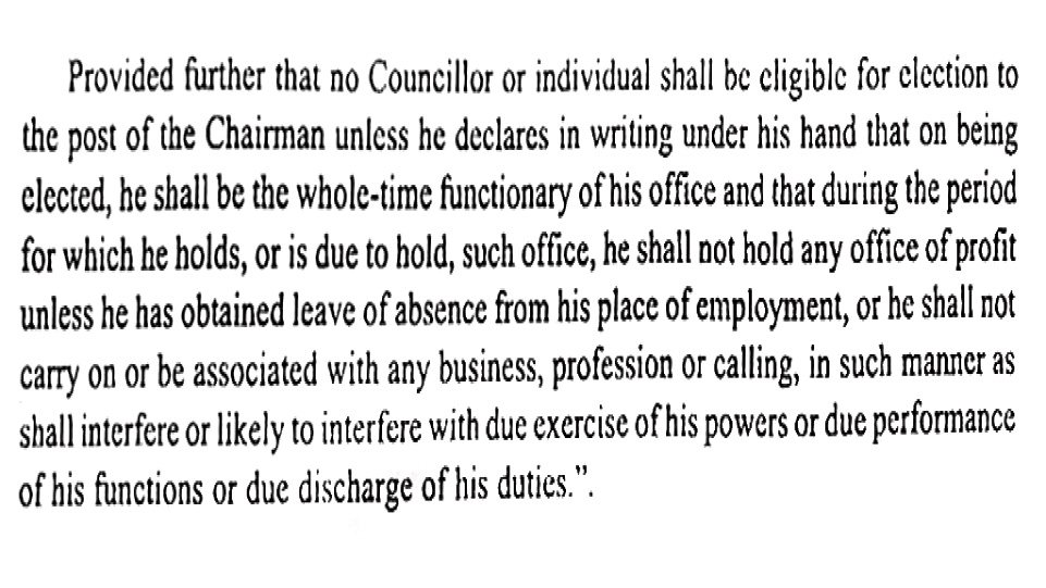 সংশোধিত আইন অনুযায়ী, পুর-চেয়ারম্যানকে সর্বক্ষণের জন্য পুরসভার কাজই করতে হবে। তিনি চেয়ারম্যান থাকাকালীন অন্য কোনও লাভজনক পদে থাকবেন না। থাকলে কর্মস্থল থেকে ছুটি নিতে হবে। এমনকি যদি তাঁর নিজস্ব ব্যবসা বা ভিন্ন পেশা থাকে বা তিনি অন্য এমন কাজের সঙ্গে যুক্ত থাকেন যা চেয়ারম্যান হিসেবে তাঁর কাজকে প্রভাবিত করবে, তা হলে তা ছেড়ে দিতে হবে। এই মর্মে হলফনামা দিলে তবেই তিনি পুর-চেয়ারম্যান পদে প্রার্থী হতে পারবেন।
