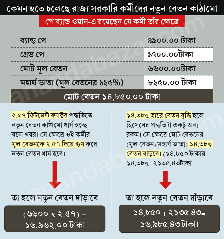 যে পদ্ধতি অনুসরণ করে বেতন সংস্কারের সুপারিশ জমা পড়ছে বলে খবর, তাতে নতুন বেতনক্রম চালু হওয়ার পর থেকে রাজ্য সরকারি চাকরিতে ন্যূনতম বেতন হবে এইটা। ২.৫৭ ফিটমেন্ট ফ্যাক্টর বা ১৪.৩৮ শতাংশ বৃদ্ধি— এর মধ্যে দ্বিতীয় পদ্ধতি অনুসৃত হলে, বেতন বৃদ্ধির পরিমাণ সামান্য বেশি হবে। তবে ফারাকটা উনিশ-বিশ।