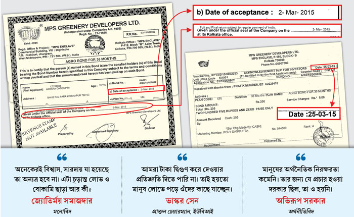 প্রশ্ন উঠছে, হাইকোর্টের নির্দেশে না হয় অফিসে তালা ঝুলল। কিন্তু এত দিন কারা ভরসা করে টাকা রাখছিলেন এই সংস্থায়? এমপিএস বা তার সমগোত্রীয় সংস্থায় টাকা রাখার সাহস কী ভাবে পাচ্ছিলেন মানুষ? এ দিনই হাইকোর্টে দু’টি রসিদ জমা পড়েছে। সেখানে দেখা যাচ্ছে এমপিএস গ্রিনারি ডেভেলপার্স লিমিটেড তাদের অ্যাগ্রো বন্ডের জন্য দু’জনের কাছে টাকা তুলেছে চলতি মাসের ২ এবং ২৫ তারিখে। গত সপ্তাহে আসডা অ্যাগ্রো প্রোজেক্টস লিমিটেড নামে একটি সংস্থার বিভিন্ন শাখায় হানা দিয়ে সিবিআই দেখেছিল, সারদা-কাণ্ডের পরেও রমরম করে চলেছে সংস্থাটি। এর থেকেই জোরালো হচ্ছে প্রশ্ন— সারদা কেলেঙ্কারি চোখের সামনে দেখার পরেও মানুষ কেন বেআইনি অর্থ লগ্নি সংস্থার ফাঁদে পা দিচ্ছেন?
