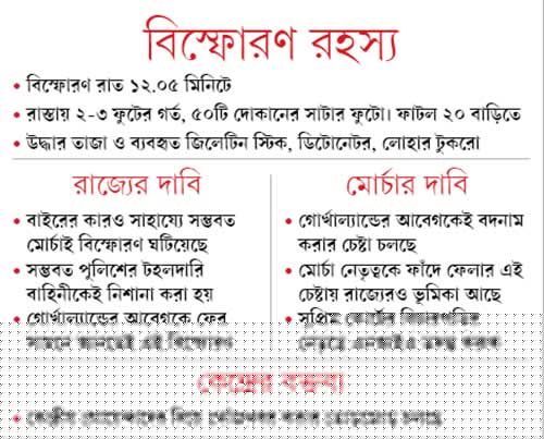 পাহাড় এমনিতেই তাড়াতাড়ি ঘুমোয়। তাই মাঝরাতে বিস্ফোরণের ঝাঁকুনিকে ঘুমের ঘোরে পলদেন লামা, রিমা ভুটিয়া, সাংদেন লেপচার মতো অনেকে ভেবেছিলেন, আবার বোধ হয় ভূমিকম্প! ওঁরা সকলেই চকবাজার লাগোয়া এলাকার বাসিন্দা। তাড়াহুড়ো করে ঘর থেকে বেরোতে গিয়েই তাঁরা বুঝতে পারেন, চারদিক অন্ধকার। লোডশেডিং। কিছুক্ষণের মধ্যেই পুলিশের গাড়ির হুটারের আওয়াজ, দমকলের ঘণ্টা, ভারী বুটের শব্দে সরগরম হয়ে ওঠে নিস্তব্ধ পুরনো সুপার মার্কেট। টর্চ বা মোবাইলের আলো জ্বেলে যাঁরা গুটি গুটি বাইরে উঁকি দিয়েছিলেন, তাঁদের নাকে এসে লাগে বারুদের গন্ধ।