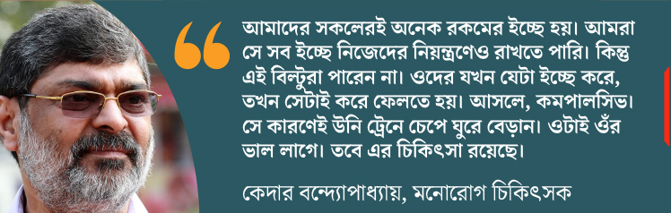 বিল্টুর কথা শুনে মনোরোগ চিকিৎসক কেদার বন্দ্যোপাধ্যায় বলছেন, ‘‘এটা একটা মানসিক রোগ। তবে সেটা নানা কারণে হতে পারে। এপিলেপ্সি বা ব্রেন টিউমারের মতো বিষয়ও থাকতে পারে তার পিছনে। রোগী না দেখে বলা সম্ভব নয়।’’ আর ট্রেন চড়ার নেশা? কেদারবাবুর কথায়, ‘‘আমাদের সকলেরই অনেক রকমের ইচ্ছে হয়। আমরা সে সব ইচ্ছে নিজেদের নিয়ন্ত্রণেও রাখতে পারি। কিন্তু এই বিল্টুরা পারেন না। ওঁদের যখন যেটা ইচ্ছে করে, তখন সেটাই করে ফেলতে হয়। আসলে, কমপালসিভ। সে কারণেই উনি ট্রেনে চেপে ঘুরে বেড়ান। ওটাই ওঁর ভাল লাগে। তবে এর চিকিৎসা রয়েছে।’’