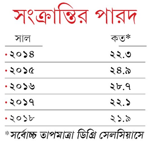 গত কয়েক দিনের তুলনায় রাতের তাপমাত্রা রবিবার সামান্য বেড়েছে। তবে দিনের তাপমাত্রা কমিয়ে সংক্রান্তিতে বাঙালির পৌষ খানিকটা জমিয়ে দেয়। হাওয়া অফিস বলছে, রবিবার কলকাতার সর্বোচ্চ তাপমাত্রা ছিল ২১.৯ ডিগ্রি সেলসিয়াস, স্বাভাবিকের থেকে চার ডিগ্রি কম। গত পাঁচ বছরে সংক্রান্তির দিনে এটাই সব থেকে কম। কলকাতায় রাতের সর্বনিম্ন তাপমাত্রা ছিল ১২.৩ ডিগ্রি, স্বাভাবিকের থেকে দু’ডিগ্রি কম। পশ্চিম বর্ধমান, মুর্শিদাবাদে এ দিনও শৈত্যপ্রবাহ চলেছে। আসানসোলে সর্বনিম্ন তাপমাত্রা ছিল আট ডিগ্রি, বহরমপুরে ৭.৪। শ্রীনিকেতনে রাতের তাপমাত্রা থিতু হয়েছে আট ডিগ্রিতে। রোদ না-মেলায় দিনের বেলাতেও তাপমাত্রা বাড়তে পারেনি।