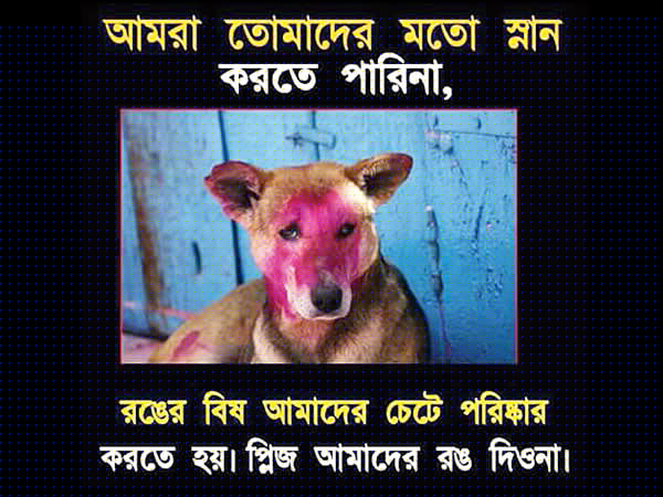 গত বছর, কৃষ্ণনগরের রাস্তায় ঘুরে বেড়ানো, দুধ সাদা কুকুরটাকে লাল, সবুজ, নীল— যে যা পেরেছিল রঙে ভরিয়ে দিয়েছিল। জিভ দিয়ে আর কতটুকু সাফ করা যায়! মাস ঘোরার আগেই সারা গা ঘায়ে ভরে গিয়েছিল তার। দিন কয়েকের মধ্যেই মারা গিয়েছিল কৃষ্ণনগরের আমিনবাজারের অতিচেনা ‘টাইগার’। বহমপুরের ইন্দ্রপ্রস্ত এলাকার ‘লালু’ও রঙের উৎসবের পরে হারিয়ে ফেলেছিল তার পুরনো চেহারা। রঙে চোবানো কুকুরটা মারা গিয়েছিল দিন কয়েকের মধ্যেই।